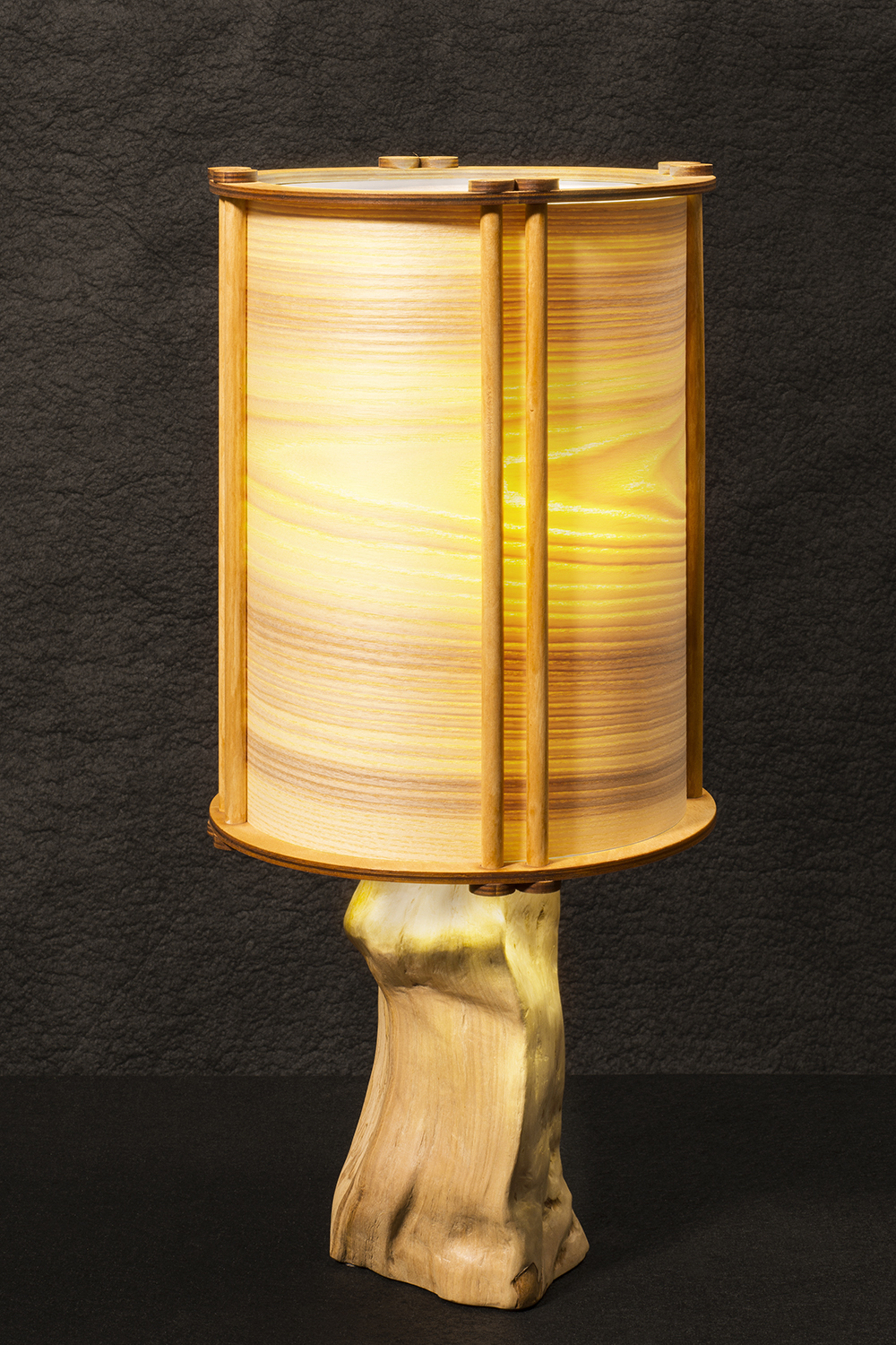 Sobremesa contrachapado base maciza de Olivo esculpidoPantalla de Fresno Olivato23x49,3 cm.E-27 RoHs máx. 20 W led1.450 gr.